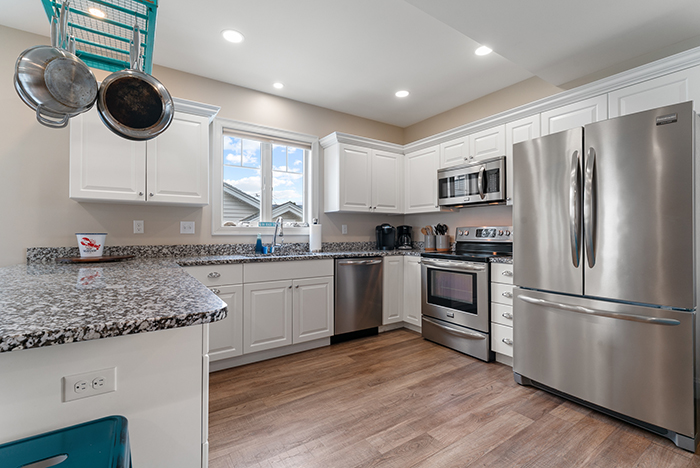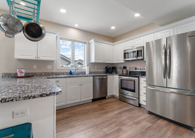 Full-size granite kitchen with dishwasher, stove/oven, sink, refrigerator, counter seating for 6